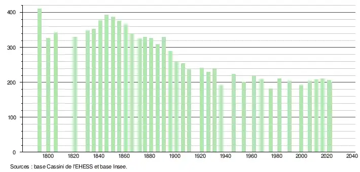 L'évolution du nombre d'habitants est connue à travers les recensements de la population effectués dans la commune depuis 1793. Pour les communes de moins de 10 000 habitants, une enquête de recensement portant sur toute la population est réalisée tous les cinq ans, les populations de référence des années intermédiaires étant quant à elles estimées par interpolation ou extrapolation[16]. Pour la commune, le premier recensement exhaustif entrant dans le cadre du nouveau dispositif a été réalisé en 2006[17].