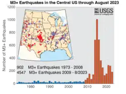Depuis la période 2010-2013, le nombre de séismes de magnitude supérieure ou égale à 3.0 a augmenté de façon spectaculaire dans l'est des États-Unis, y compris dans des zones considérées comme à très faible risque sismique.