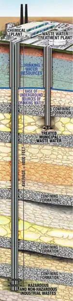 Certains puits profonds sont conçus pour l'injection et le stockage de déchets dangereux ou de dioxyde de carbone sous pression, loin sous la surface terrestre. Dans ces cas, de multiples systèmes de sécurité, de fermeture et d'étanchéité sont nécessaires. « Les matériaux utilisés pour le puits et les procédures d’abandon de puits doivent être choisis de façon à éviter toute fuite (de CO2) le long du puits et d’assurer la sécurité à long terme du stockage » (le CO2 sous pression et/ou dilué dans l'eau est acide et corrosif et peut endommager le cuvelage métallique et le ciment périphérique[2]