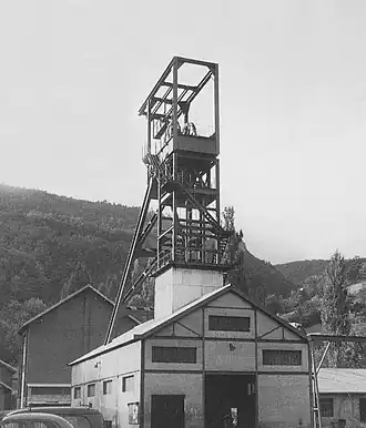 Vue du chevalement provisoire pendant le fonçage.- Vue du chevalement et des Alpes.