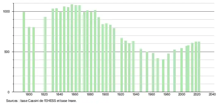 L'évolution du nombre d'habitants est connue à travers les recensements de la population effectués dans la commune depuis 1793. Pour les communes de moins de 10 000 habitants, une enquête de recensement portant sur toute la population est réalisée tous les cinq ans, les populations de référence des années intermédiaires étant quant à elles estimées par interpolation ou extrapolation[32]. Pour la commune, le premier recensement exhaustif entrant dans le cadre du nouveau dispositif a été réalisé en 2008[33].