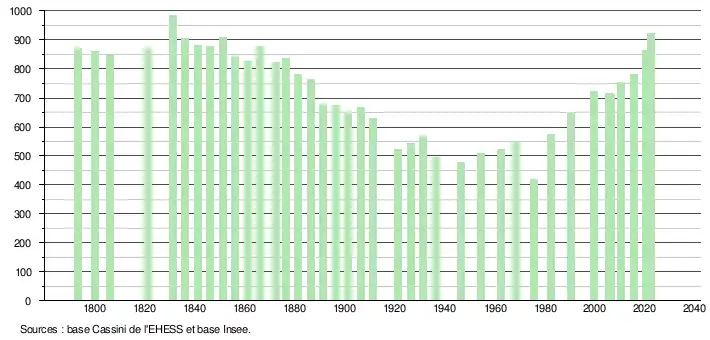 L'évolution du nombre d'habitants est connue à travers les recensements de la population effectués dans la commune depuis 1793. Pour les communes de moins de 10 000 habitants, une enquête de recensement portant sur toute la population est réalisée tous les cinq ans, les populations de référence des années intermédiaires étant quant à elles estimées par interpolation ou extrapolation[30]. Pour la commune, le premier recensement exhaustif entrant dans le cadre du nouveau dispositif a été réalisé en 2005[31].