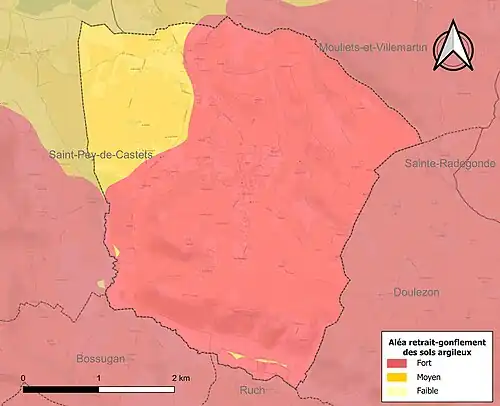 Le retrait-gonflement des sols argileux est susceptible d'engendrer des dommages importants aux bâtiments en cas d’alternance de périodes de sécheresse et de pluie. La totalité de la commune est en aléa moyen ou fort (67,4 % au niveau départemental et 48,5 % au niveau national). Sur les 324 bâtiments dénombrés sur la commune en 2019, 324 sont en aléa moyen ou fort, soit 100 %, à comparer aux 84 % au niveau départemental et 54 % au niveau national. Une cartographie de l'exposition du territoire national au retrait gonflement des sols argileux est disponible sur le site du BRGM[18],[Carte 2].