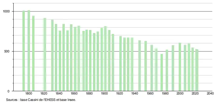 L'évolution du nombre d'habitants est connue à travers les recensements de la population effectués dans la commune depuis 1793. Pour les communes de moins de 10 000 habitants, une enquête de recensement portant sur toute la population est réalisée tous les cinq ans, les populations de référence des années intermédiaires étant quant à elles estimées par interpolation ou extrapolation[27]. Pour la commune, le premier recensement exhaustif entrant dans le cadre du nouveau dispositif a été réalisé en 2006[28].