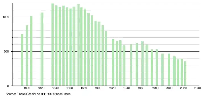 L'évolution du nombre d'habitants est connue à travers les recensements de la population effectués dans la commune depuis 1793. Pour les communes de moins de 10 000 habitants, une enquête de recensement portant sur toute la population est réalisée tous les cinq ans, les populations de référence des années intermédiaires étant quant à elles estimées par interpolation ou extrapolation[15]. Pour la commune, le premier recensement exhaustif entrant dans le cadre du nouveau dispositif a été réalisé en 2007[16].
