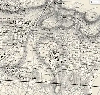 En 1832, la liaison entre le vignoble de Bourgogne et son principal marché (Paris) s'améliore avec l'ouverture du canal de Bourgogne[22] ; puis en 1849 avec l'inauguration de la ligne de chemin de fer desservant Chagny et remontant vers Dijon en suivant le pied de la côte. Mais l'extension du réseau encore plus loin vers le sud (la ligne PLM) met à mal pendant la seconde moitié du XIXe siècle la partie du vignoble de Bourgogne qui produisait des vins de consommation courante (produit en général avec du gamay) : ces vins entrent en concurrence avec ceux des autres vignobles, notamment ceux de la plaine du Languedoc et d'Algérie, moins chers, plus foncés et plus alcoolisés. Au milieu du XIXe siècle, Puligny produit surtout du rouge ordinaire à base de gamay[15], puis progressivement le chardonnay remplace les cépages noirs sur presque tout le vignoble communale.