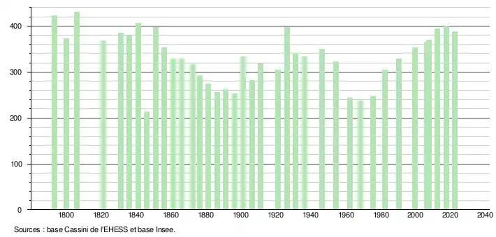 L'évolution du nombre d'habitants est connue à travers les recensements de la population effectués dans la commune depuis 1793. Pour les communes de moins de 10 000 habitants, une enquête de recensement portant sur toute la population est réalisée tous les cinq ans, les populations de référence des années intermédiaires étant quant à elles estimées par interpolation ou extrapolation[24]. Pour la commune, le premier recensement exhaustif entrant dans le cadre du nouveau dispositif a été réalisé en 2007[25].