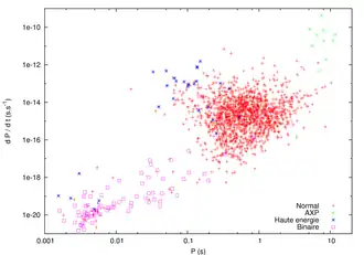 - Certains pulsars ne sont pas uniquement observés dans le domaine radio, mais présentent une émission modulée de haute énergie, c'est-à-dire dans le domaine des rayons X ou des rayons gamma. Ces pulsars ont un ralentissement très élevé, supérieur à 10-14 voire 10-10. La valeur élevée du ralentissement indique des objets jeunes, hypothèse compatible avec une émission de haute énergie. Ces pulsars à émission de haute énergie se scindent en deux populations distinctes : une avec une courte période (de l'ordre de 0,1 seconde) et un ralentissement modérément élevé (entre 10-13 et 10-14 s.s-1, l'autre avec une période très longue (entre 5 et 12 secondes) et un ralentissement très élevé (pouvant dépasser 10-10 s.s-1). Cette seconde classe représente ce que l'on appelle les pulsars X anormaux (voir ci-dessous).
