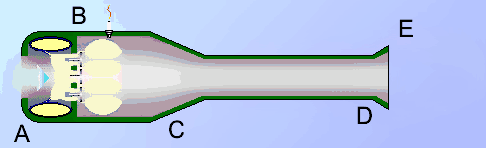 - Les gaz de combustion s'échappent par la tuyère, avec une vitesse accrue (par rapport à leur vitesse à l'entrée) par leur détente, ce qui engendre la poussée.