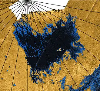 - USGS Planetary Nomenclature – Titan Contours de la région du pôle nord de Titan, avec de nombreuses surfaces interprétées comme des étendues liquides.