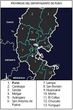 La région de Puno est composée de 13 provinces qui sont elles-mêmes divisées en 108 districts :