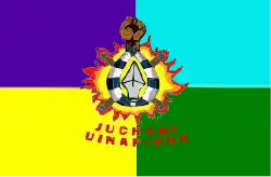 Le drapeau porte les couleurs violet, bleu, jaune et vert[21] :