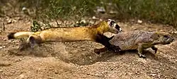 Le putois à pieds noirs est un carnivore principalement nocturne étroitement associé au chien de prairie (Cynomys), bien qu'il ait été prouvé[7] qu'il puisse également être associé aux populations d'écureuils terrestres (Bermoohilus armatus)[8].