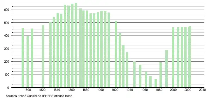 L'évolution du nombre d'habitants est connue à travers les recensements de la population effectués dans la commune depuis 1793. Pour les communes de moins de 10 000 habitants, une enquête de recensement portant sur toute la population est réalisée tous les cinq ans, les populations de référence des années intermédiaires étant quant à elles estimées par interpolation ou extrapolation[19]. Pour la commune, le premier recensement exhaustif entrant dans le cadre du nouveau dispositif a été réalisé en 2006[20].