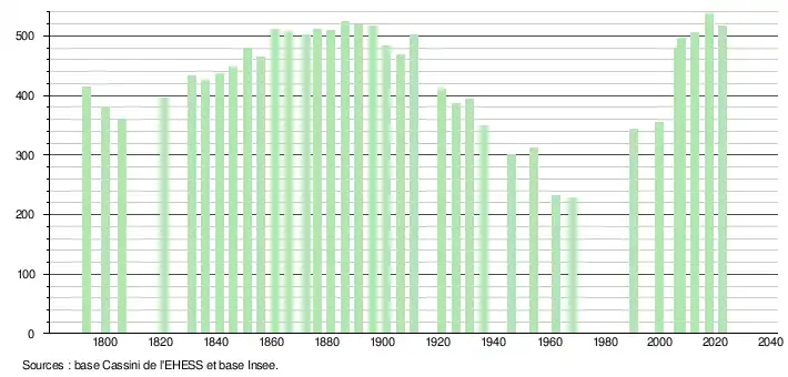 L'évolution du nombre d'habitants est connue à travers les recensements de la population effectués dans la commune depuis 1793. Pour les communes de moins de 10 000 habitants, une enquête de recensement portant sur toute la population est réalisée tous les cinq ans, les populations de référence des années intermédiaires étant quant à elles estimées par interpolation ou extrapolation[18]. Pour la commune, le premier recensement exhaustif entrant dans le cadre du nouveau dispositif a été réalisé en 2007[19].