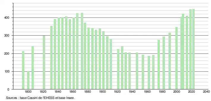 L'évolution du nombre d'habitants est connue à travers les recensements de la population effectués dans la commune depuis 1793. Pour les communes de moins de 10 000 habitants, une enquête de recensement portant sur toute la population est réalisée tous les cinq ans, les populations de référence des années intermédiaires étant quant à elles estimées par interpolation ou extrapolation[17]. Pour la commune, le premier recensement exhaustif entrant dans le cadre du nouveau dispositif a été réalisé en 2008[18].