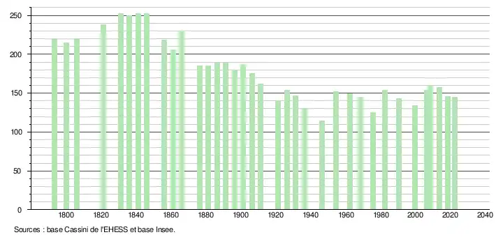 - ↑ Population municipale de référence en vigueur au 1er janvier 2025, millésimée 2022, définie dans les limites territoriales en vigueur au 1er janvier 2024, date de référence statistique : 1er janvier 2022.