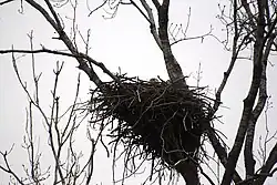 Mâle et femelle construisent ensemble le nid, posé sur le sol, accroché à une falaise ou installé sur un buisson ou dans un grand arbre (de préférence un pin dans une grande partie de l'aire de répartition), près d'une étendue d'eau. Le pygargue à tête blanche construit les plus grands nids d'Amérique du Nord : ils peuvent atteindre quatre mètres de hauteur, pour 2,5 mètres de largeur et peser jusqu'à une tonne[2], mais la dépression centrale n'atteint qu'une dizaine de centimètres. On a trouvé en Floride un nid de 6,1 mètres de hauteur, 2,9 mètres de largeur et pesant 2,7 tonnes[27]. Les rapaces peuvent aussi tout simplement ajouter à leur aire déjà installée des matériaux divers : verdures, lambeaux de peau, pelotes de réjection, branches... Le nid peut ainsi être regarni chaque année pendant une très longue période, près de 70 ans, avant de s’effondrer sous son poids.