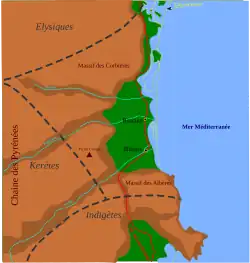 Les Volques et les Sardones ont dû occuper postérieurement les territoires des Elysiques et des Bébryces. Ces terres correspondent peut-être aux territoires actuels du Roussillon[n 5],[n 4] et des flancs des Pyrénées limitant le Roussillon au Nord-Ouest, à l'Ouest et au Sud (Razes, pays de Saut, Capcir, Fenouillèdes, Conflent, Vallespir).