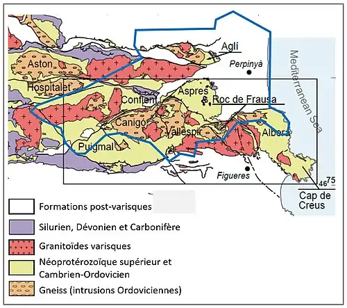 - ↑ Genna A. (2009) Carte géologique harmonisée du département des Pyrénées-Orientales. Notice technique, Rapport final, BRGM/RP-57032-FR, en particulier pages 417-8. http://infoterre.brgm.fr/rapports/RP-57032-FR.pdf, consulté le 24 octobre 2021.