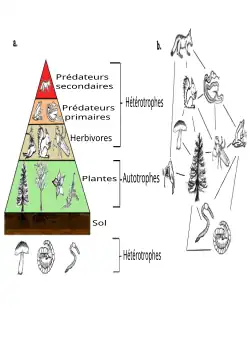 La pyramide écologique est une forme de représentation graphique pour indiquer des rapports entre différentes catégories d'espèces correspondant à différents niveaux trophiques. Le premier maillon est les décomposeurs, puis les plantes autotrophes, les herbivores, les prédateurs primaires et les prédateurs secondaires, voire les prédateurs tertiaires (superprédateurs).