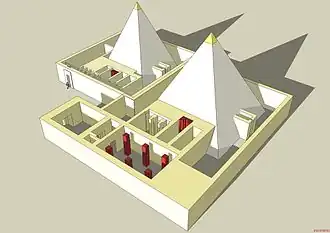 - ↑ Cette particularité ne peut s'expliquer que par le fait qu'un monument antérieur ne pouvant être détruit empêchait un alignement des différentes parties du complexe pyramidal