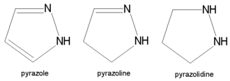 Les composés structurellement apparentés au pyrazole sont ses formes réduites, la pyrazoline et la pyrazolidine (en).