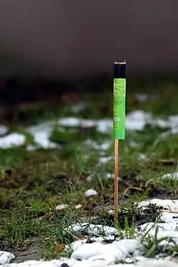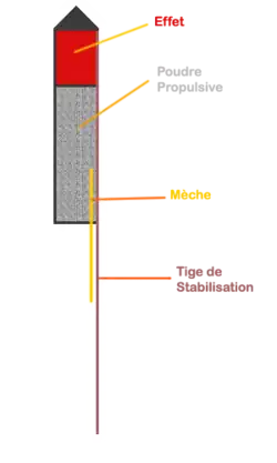 - La fusée : elle se compose d'une tige stabilisatrice et d'un tube cylindrique contenant, à la base, la poudre pour la propulsion, et au sommet, la poudre avec les effets. Lorsque la combustion de la poudre de propulsion se termine, elle met le feu aux effets.