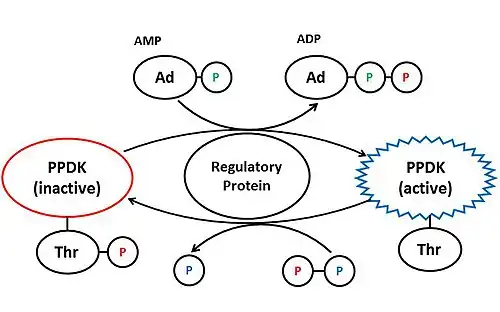La pyruvate phosphate dikinase est régulée par la protéine de régulation de la pyruvate phosphate dikinase (en)[3] (PDRP). Sous forte illumination, cette protéine déphosphoryle le résidu de Thr-456 de la pyruvate phosphate dikinase, ce qui a pour effet d'activer l'enzyme[8] ; elle l'inactive par phosphorylation sur ce même résidu à partir de pyrophosphate inorganique. La PDRP est une protéine de régulation particulière en ce qu'elle catalyse à la fois l'activation et l'inactivation de la PPDK à travers deux mécanismes différents[8].