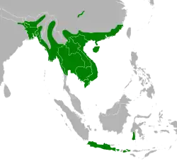 Cette espèce se rencontre dans le sud du Népal, en Inde, au Bangladesh, en Birmanie, en Thaïlande, au Laos, au Cambodge, au Viêt Nam, dans le sud de la république populaire de Chine (Fujian, Jiangxi, Guangdong, Hainan, Guangxi, Yunnan) et en Indonésie sur les îles de Java, de Bali et de Sulawesi[1].