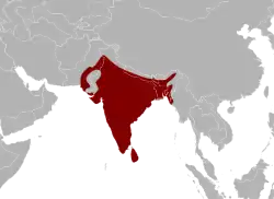 Cette espèce se rencontre au Pakistan, en Inde, en Birmanie, au Sri Lanka, au sud du Népal, au Bhoutan, au Bangladesh et au Viêt Nam[1].