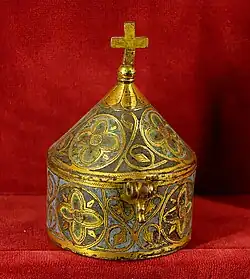 Anciennement, la pyxide tenait lieu de tabernacle. Elle était déposée dans une niche pratiquée dans le mur latéral du sanctuaire, près de l'autel, ou suspendue au-dessus de l'autel.