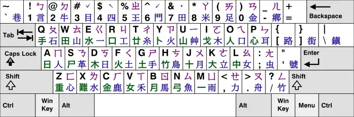 Taïwan utilise un clavier plus complexe, avec 4 caractères par touche, le QWERTY, en haut à gauche, le bopomofo (ou zhuyin), en haut à droite, et deux clés de caractères chinois han (hanzi) pour différents systèmes en bas, à gauche et à droite.