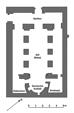 Narthex, nef et bas côtés étaient voûtés, le sanctuaire était couvert par un semi-dôme. Le plancher est constitué de dalles de grès reposant sur un sol en terre battue.