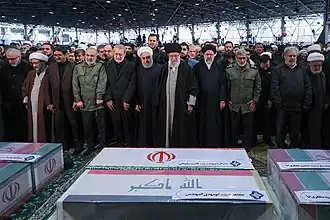 Le 4 janvier, des dizaines de milliers d'Irakiens brandissant les drapeaux des milices des Hachd al-Chaabi défilent en cortège à Bagdad[62],[63]. Le Premier ministre démissionnaire Adel Abdel-Mehdi, l'ancien Premier ministre Nouri al-Maliki, le chef du Hachd Faleh al-Fayadh, le chef de l'Organisation Badr Hadi al-Ameri et les chefs d'autres milices participent aux obsèques[62],[63]. Le convoi transportant les dix corps traverse ensuite Kerbala et Nadjaf[62],[63]. En Iran, trois jours d'hommage national sont décrétés par les autorités[64],[65]. Le 5 janvier, le convoi funéraire transportant les restes de Soleimani, d'al-Mouhandis et des quatre autres officiers iraniens traversent les villes d'Ahvaz et de Mechhed en présence d'une foule immense[64],[66],[67]. Le 6, le Guide de la Révolution Ali Khamenei fait la prière funéraire devant les six cercueils à l'Université de Téhéran, puis le convoi traverse Téhéran en présence d'une foule estimée à plusieurs millions de personnes par la télévision d'État[66],[68],[69],[67]. Des drapeaux américains et israéliens sont brûlés[69],[70]. Le cercueil de Soleimani est ensuite transféré vers la ville sainte chiite de Qom[69]. Le corps de Soleimani est enterré à Kerman le 7 janvier, mais une bousculade pendant la procession funéraire fait au moins 56 morts et 212 blessés[71],[72].