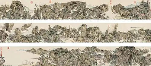 - Paysage de rivière et de montagne, encre et couleurs légères sur papier, rouleau en hauteur ;