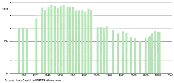 L'évolution du nombre d'habitants est connue à travers les recensements de la population effectués dans la commune depuis 1793. Pour les communes de moins de 10 000 habitants, une enquête de recensement portant sur toute la population est réalisée tous les cinq ans, les populations de référence des années intermédiaires étant quant à elles estimées par interpolation ou extrapolation[32]. Pour la commune, le premier recensement exhaustif entrant dans le cadre du nouveau dispositif a été réalisé en 2005[33].