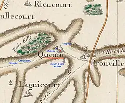 La carte de Cassini ci-contre montre qu'au milieu du XVIIIe siècle, Quéant est une paroisse traversée par le ruisseau L'Hirondelle.