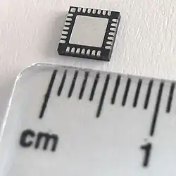 Le boîtier QFN est similaire au Quad Flat Package, mais sans qu'aucune broche ne sorte des côtés du boîtier. Il est donc difficile de souder manuellement un boîtier QFN.