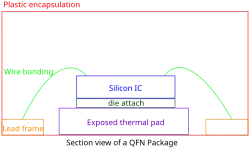 La figure montre la section transversale d'un boîtier QFN avec grille de connexion et câblage. Il existe deux types de conception du boîtier, la séparation par poinçonnage et la séparation par sciage[3]. La séparation par scie découpe un grand ensemble de boîtiers en plusieurs parties. Dans le cas du poinçonnage, un seul boîtier est mis en forme à l'aide d'un moule.