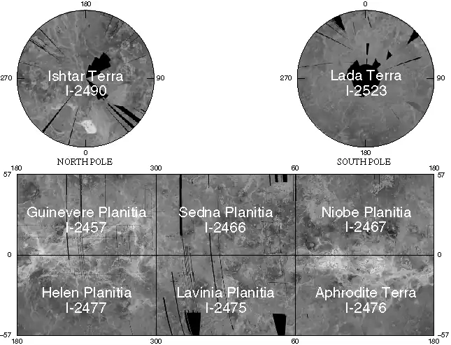 L'USGS a divisé la surface de Vénus en 8 quadrangles régionaux, permettant une représentation au 1 / 10 000 000[1].