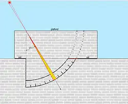 - le mural (3) de Ray est bien documenté[6] ; de 20 m de rayon, il est gradué uniquement sur le secteur fonctionnel, soit de 0 à 60°, d'où son nom de « sextant ». C'est alors la hauteur zénithale à midi zm qui est lue au lieu de son complément hm. La résolution est de 10″, mais l'incertitude de mesure, inconnue, doit être bien supérieure[N 6]. Pour réduire l'incertitude du mesurage, les astronomes employaient un cercle réticulé, de la dimension de la tache de lumière, qu'ils déplaçaient sur l'image du soleil. La détection du lieu de l'intersection était de ce fait plus exacte.