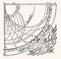 - le quadrant nouveau ou quadrans novus[N 3], dit aussi astrolabe-quadrant, dont l'invention a longtemps été attribuée à Profacius en 1263. Ce n'est qu'un astrolabe planisphérique réduit par rabattements et rotation à un quart de cercle ; Certains de ces instruments comportent un diagramme d'heures temporaires, comme le quadrant ancien ;