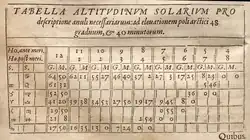 - ↑ L'obtention de cette table est dite suivre la relation (1) donnée précédemment. Pour obtenir ces hauteurs, la déclinaison, non précisée, doit être connue ; est-elle obtenue graphiquement ou à partir de la relation ? Relation où δ est la déclinaison, ε l'obliquité de l'écliptique et λ la longitude écliptique du Soleil.