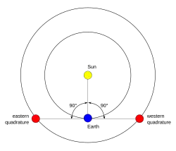 Comme le montre le diagramme, une planète (ou un autre objet) peut être à la quadrature ouest (quand elle est à l'ouest du Soleil vue de la Terre) ou à la quadrature est (quand elle est à l'est du Soleil vu de la Terre). Notez qu'une planète inférieure ne peut jamais être en quadrature par rapport à la planète de référence.
