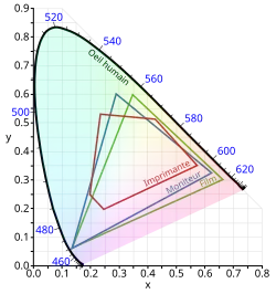 - ↑ Les écrans de télévision et d'ordinateur peuvent représenter environ la moitié des couleurs que la vision humaine peut distinguer.