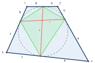 où la corde de contact de longueur k relie les côtés de longueurs a = e + f et c = g + h, et celle de longueur l relie les côtés de longueurs b = f + g et d = h + e.