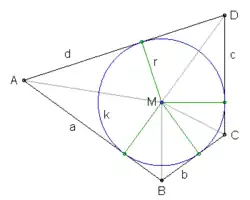 Le rayon r du cercle inscrit dans un quadrilatère circonscriptible de côtés a, b, c, d est donné par[11] :