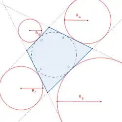 où Ra, Rb, Rc, Rd sont les rayons des cercles extérieurs tangents au côté de longueurs respectives a, b, c, d et aux prolongements des deux côtés adjacents[10].