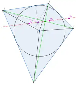 Soit un quadrilatère ABCD circonscriptible dont le cercle inscrit a pour centre centre I et dont les diagonales se coupent en P, soient H1, H2, H3, H4 les orthocentres respectifs des triangles AIB, BIC, CID et DIA . Alors les points P, H1, H2, H3, H4 sont alignés[13].